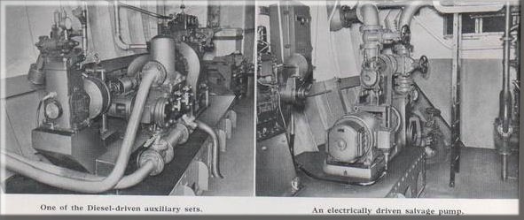 In addition to the two stroke reversing main propulsion engine, the tug carried two Newbury four stroke engines, one of which at 30bhp, ran a generator/compressor set, the other a slightly smaller engine of 20bhp, also driving a generator but with a pump set. The salvage pump, shown on the right, was driven by an electric motor.