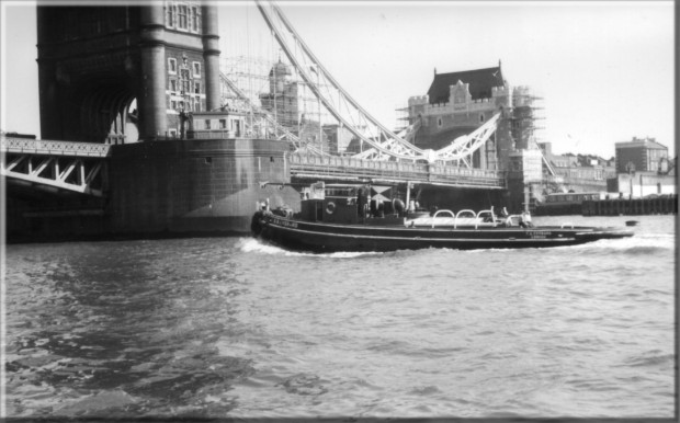 This picture shows the SA Everard on 29th June 1976, sporting the Everard colours on the funnel, just passing under Tower Bridge in the Pool of London.
